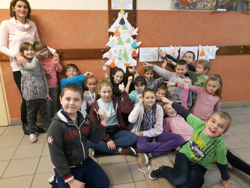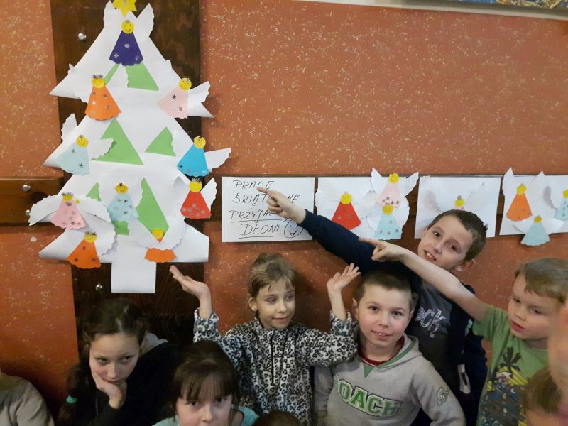 Na naszym spotkaniu gościem specjalnym była pani Ania Sekuła. Podczas spotkania były robione świąteczne prace plastyczne. Każdy uczeń wykonał z kolorowego papieru swojego aniołka. Z drugiej strony aniołka zasiały zapisane życzenia. Liczymy, że się spełnią ! :) Następnie aniołki zostały umieszczone na pięknej, papierowej choince :) Pracę dzieci z Przyjaznej Dłoni można podziwiać na szkolnym korytarzu. Na zdjęciach dzieci z Przyjaznej Dłoni wraz z panią Anią Sekuła - obok światecznej, papierowej choinki :)
