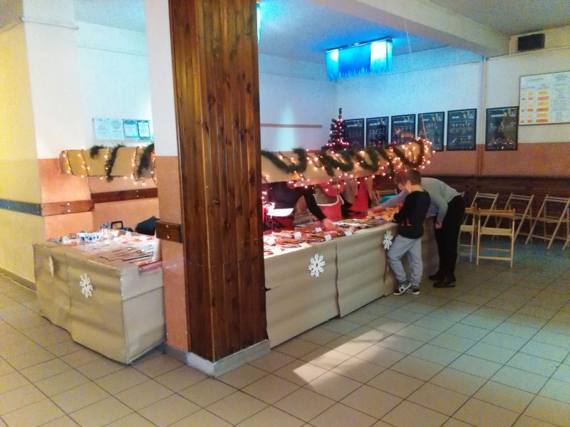 z oryginalnymi, pomysłowymi pracami naszych dzieci i nauczycieli.  Wyroby te ujawniają nieprzeciętne talenty artystyczne naszych młodych artystów.  Przy stoisku jarmarkowym obok choinki można usiąść i porozmawiać, co  stwarza szczególną atmosferę. Zapraszamy!