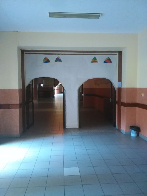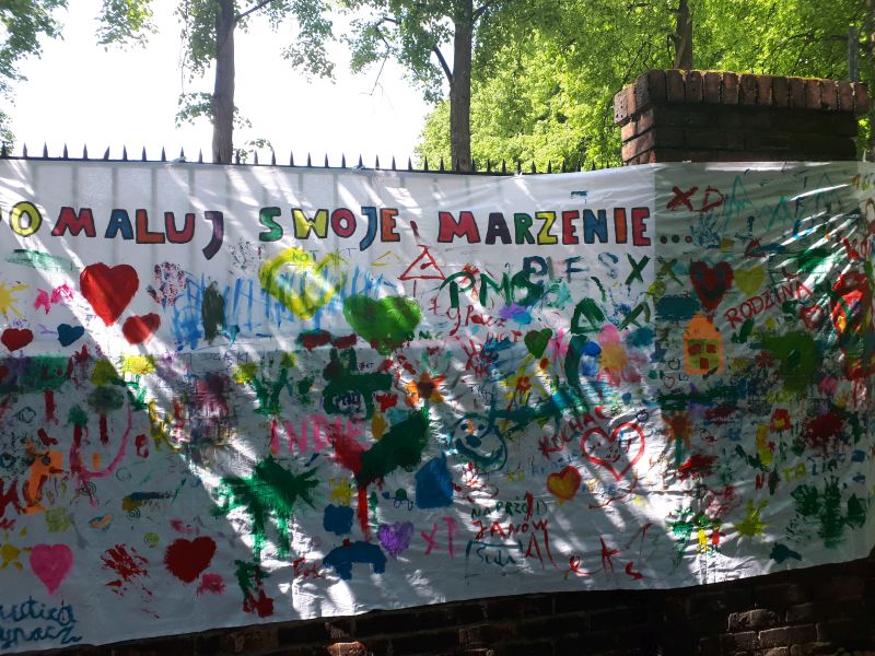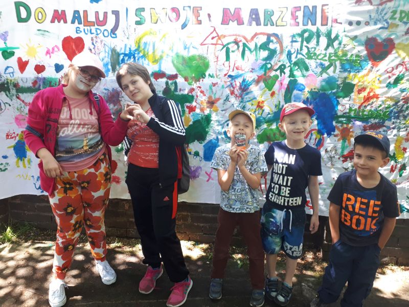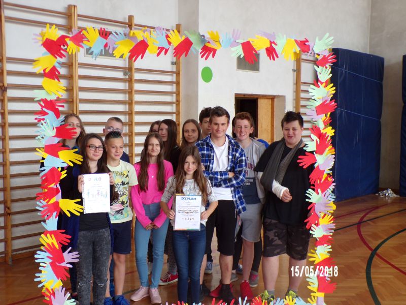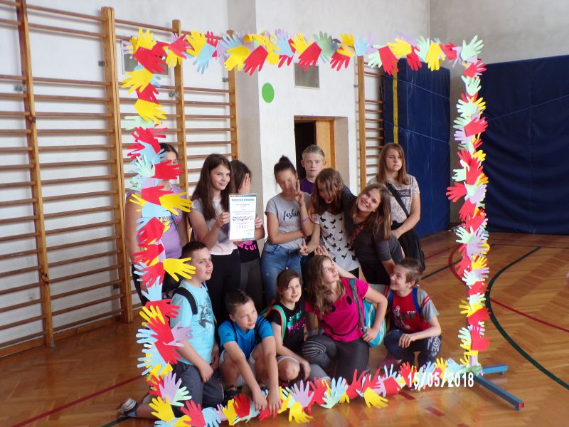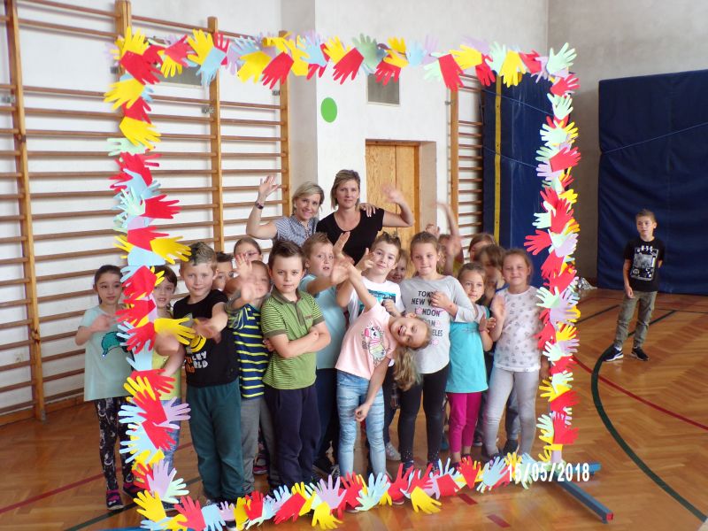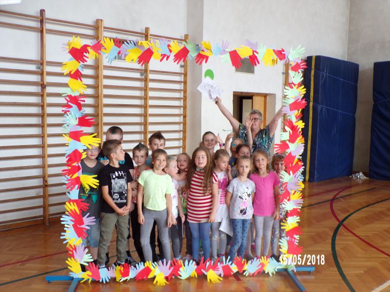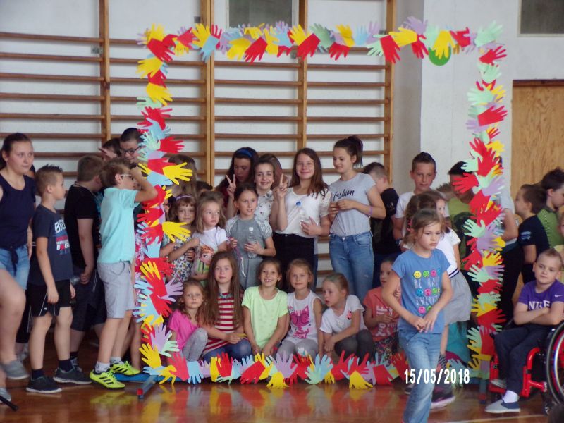 A oto my - uczestnicy XVIII Międzyszkolnego Festynu Integracyjnego. W tle nasze dzieło – ramka stworzona z naszych dłoni. Otwarte dłonie są dla nas symbolem tolerancji wobec wszystkich ludzi – bez względu na wygląd, zainteresowania, wykonywaną pracę.