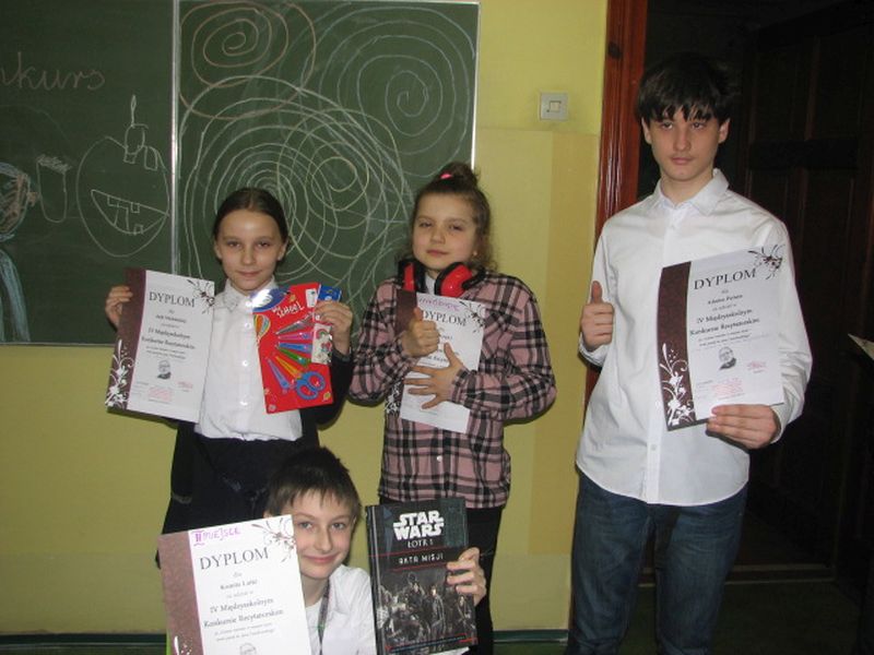 Tematyka utworów nie była łatwa, jednak nasi uczniowie doskonale zaprezentowali swoje umiejętności recytatorskie i artystyczne. Olga otrzymała wyróżnienie, a Kamil zajął II miejsce, natomiast Julia została doceniona za umiejętność prezentacji wiersza, a Adam za debiut sceniczny.