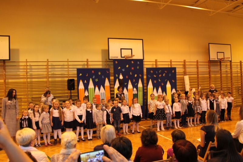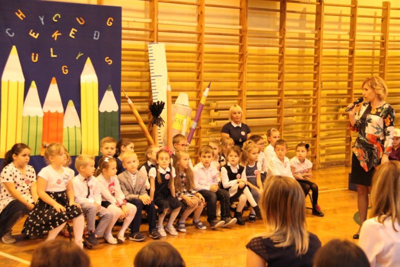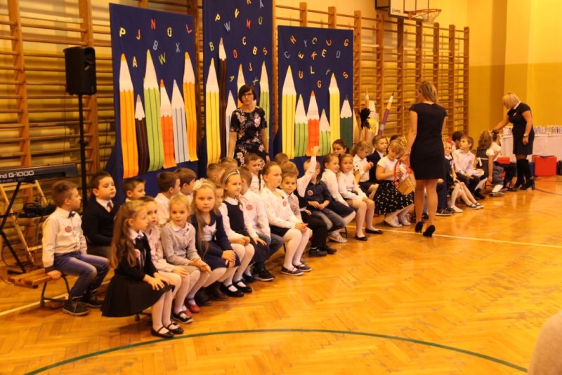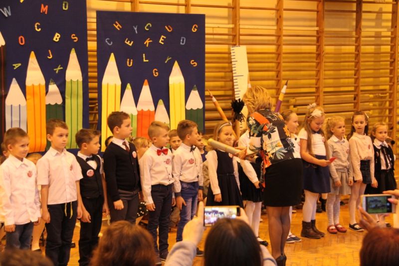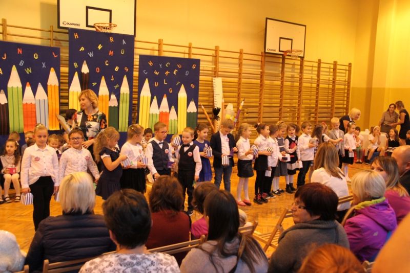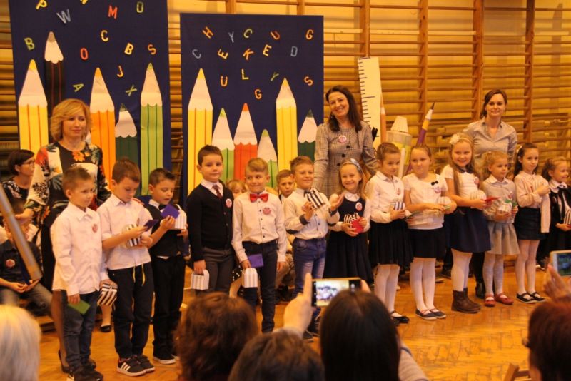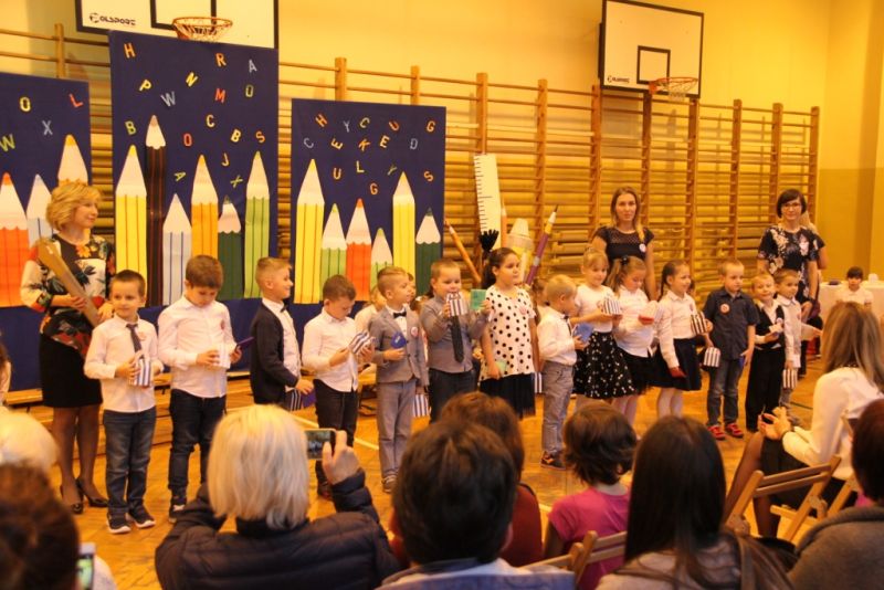 i przemówiła do pierwszoklasistów. Następnie uczniowie z wielkim zaangażowaniem recytowali wiersze i śpiewali piosenki. Po programie artystycznym i ślubowaniu Pani Dyrektor uroczyście pasowała uczniów. Wychowawczynie wręczyły pierwszoklasistom legitymacje oraz słodki upominek.