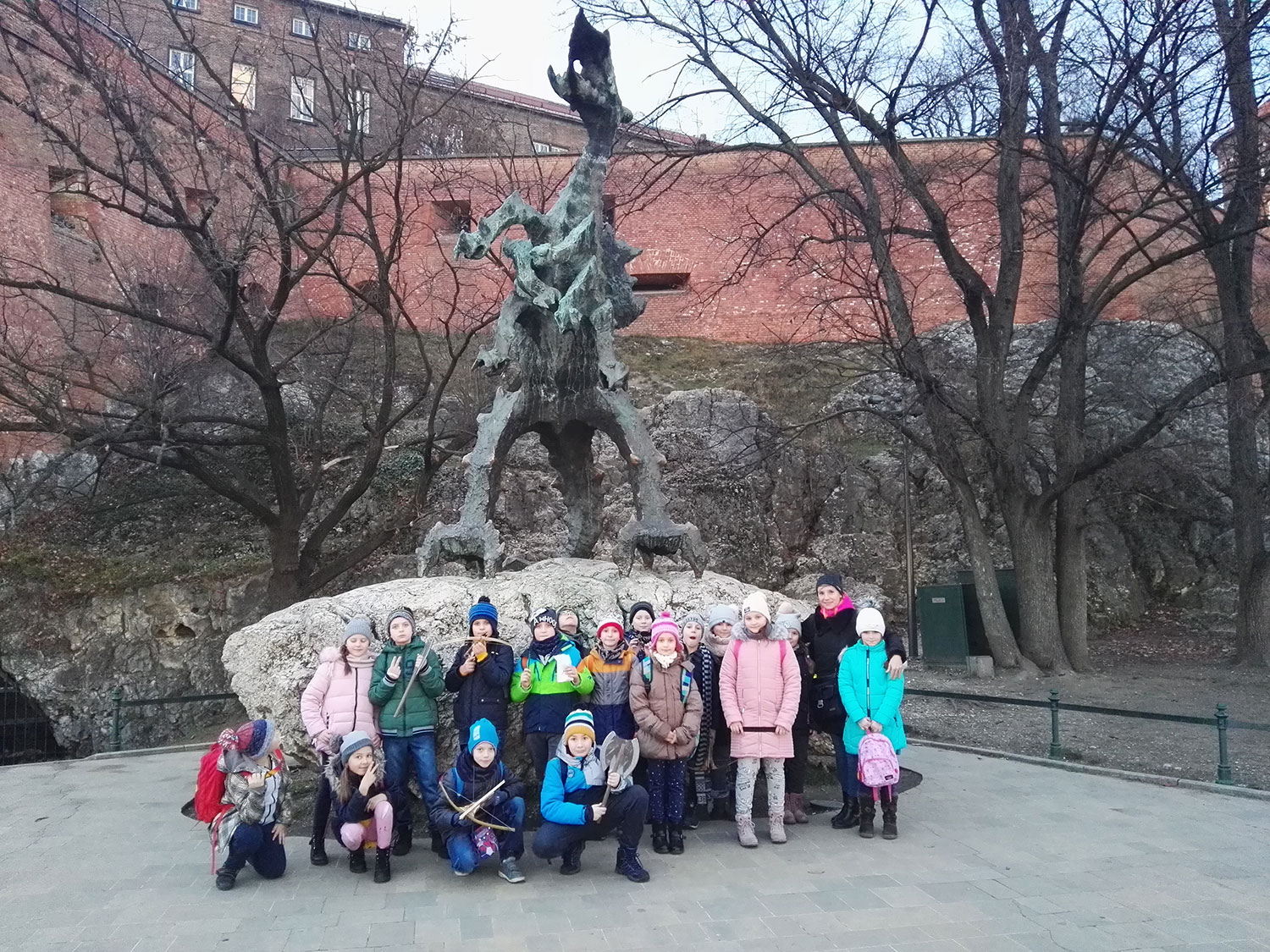 Kolejną atrakcją było zwiedzanie Krakowa. Pan przewodnik opowiadał wiele legend związanych z drugą stolicą Polski. Oczywiście nie mogło zabraknąć pamiatkowego zdjęcia przy Smoku Wawelskim. Największą atrakcją były zakupy na jarmarku światecznym.Chłopcy jak na prawdziwych wojowników przystało kupili miecze, tarcze i kusze, a dziewczynki jak prawdziwe księżniczki kupowały kolczyki, korale, wisiorki i bransoletki. Pogoda i humory dopisały.