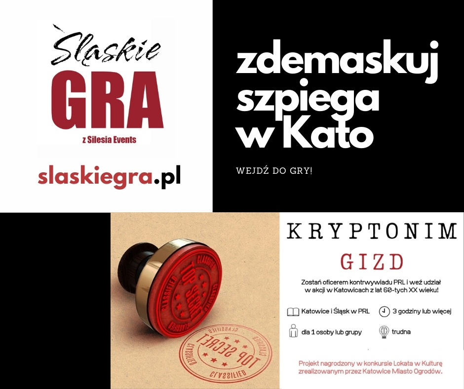 Tych, którzy lubią zagadki kryminalne, wyzwania i szyfry zapraszamy do zabawy w KRYPTONIM GIZD. W grze zamieniamy się w tajnego oficera z lat 60-tych XX wieku, którego zadaniem jest zdemaskowanie szefa siatki szpiegowskiej obcego wywiadu. Grze towarzyszą ciekawostki z peerelowych Katowic.