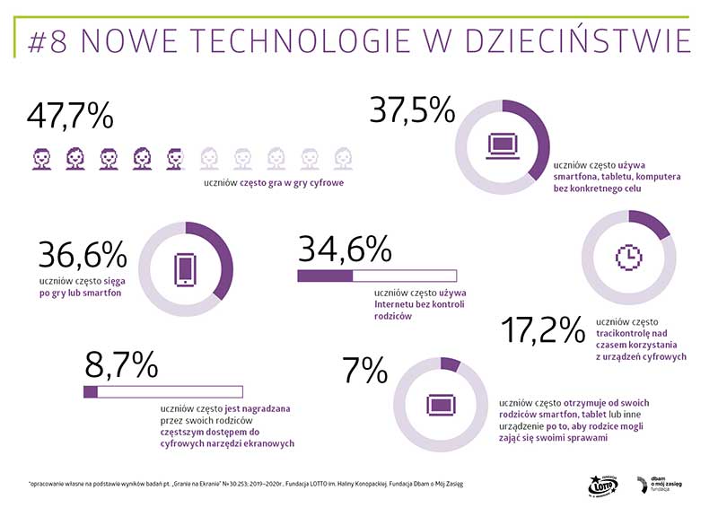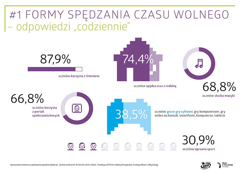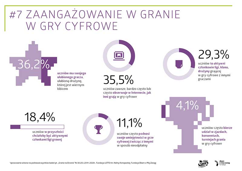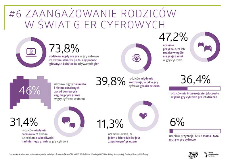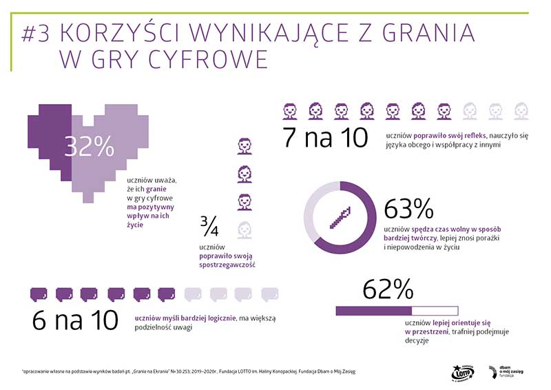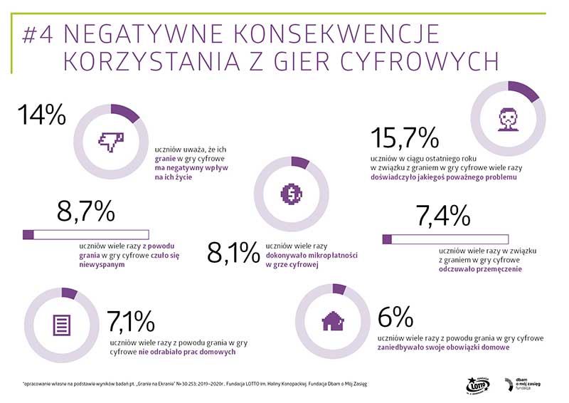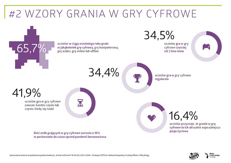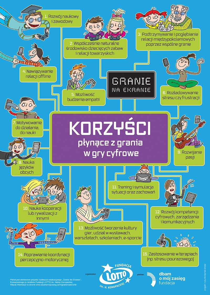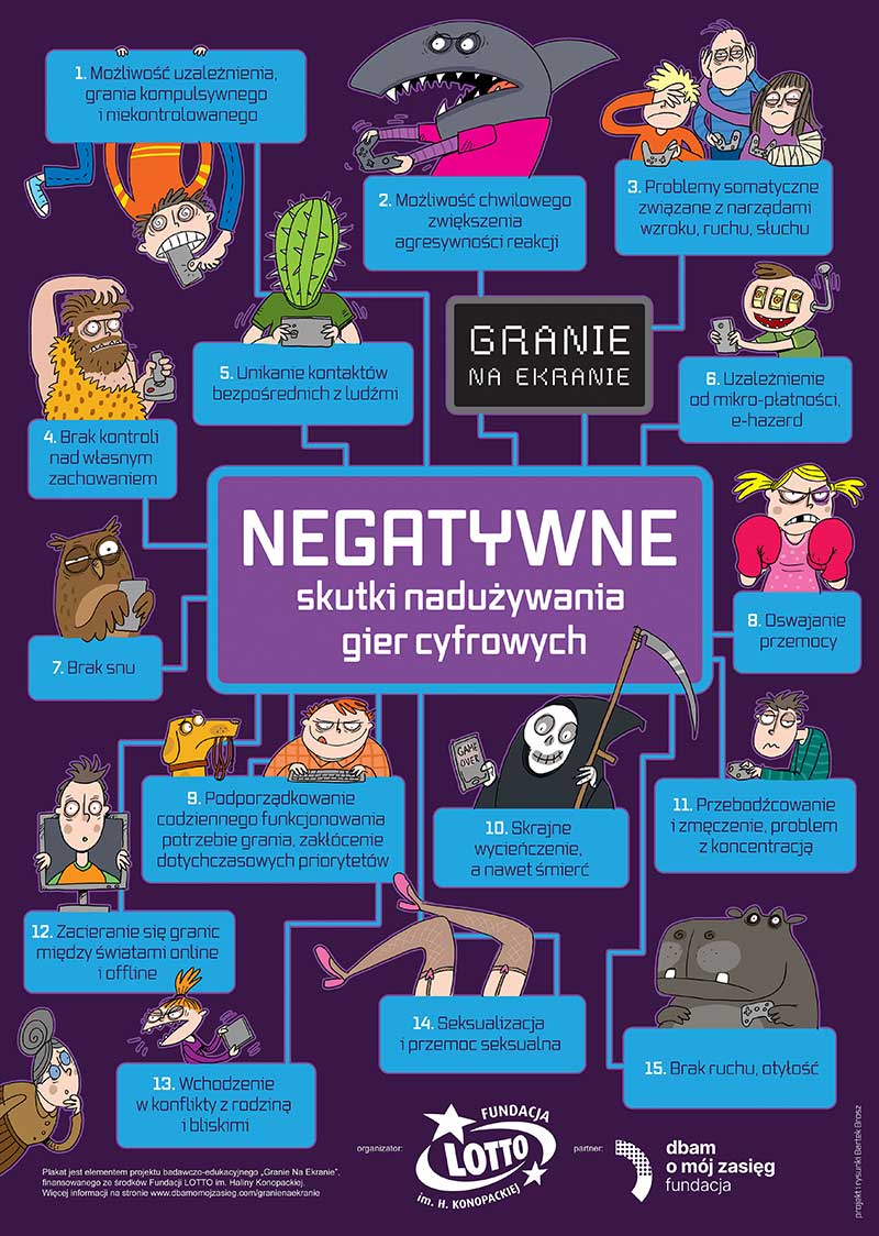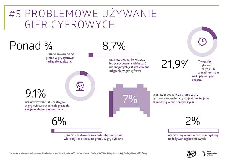 W ramach programu Szkoła Odpowiedzialna Cyfrowo, w którym uczestniczy Nasza Szkoła zachęcamy Wszystkich do zapoznania się z negatywnymi skutkami nadużywania gier cyfrowych, korzyściami płynącymi z tej formy spędzania czasu wolnego przez uczniów oraz wynikami badań, których  autorem jest Fundacja Dbam o Mój Z@sięg i Fundacja LOTTO im. Haliny Konopackiej.